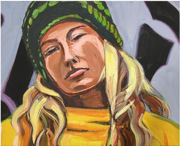 Das 2007 datierte Werk „Ilka“ entstammt der Serie der „ABC-Porträts“. Es zeigt eine junge Frau mit geschlossenen Augen in leichter Untersicht als Schulterstück. Aus ihrer grünen Mütze fallen blonde Locken über ihr leuchtend gelbes Gewand. Mit halbgeschlossenen Augen blickt „Ilka“ den oder die Betrachter*in an, der sich ihrem Auftritt nicht entziehen kann.