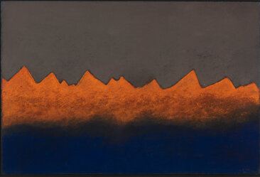 Mit dem Thema Berg hat sich Knaupp dabei von Anfang an auseinandergesetzt. Das aus der Sammlung von Madi und Peter Schmid der Kunstvilla zugegangene großformatige Pastell „Berge“ ist mit „1.9.1996“ datiert. Eine kontrastreiche Bergkette in leuchtendem Orange hebt sich vom braunen Hintergrund, sowie dem kobaltblauen Vordergrund ab. Die Gipfel sind mit Konturlinien noch zusätzlich abgegrenzt. „Landschaftliche Formationen sind immer Metaphern für eigene Empfindungen“ sagt Knaupp selbst. Landschafts- und Menschenbild werden eins.