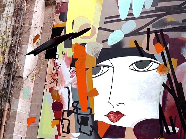Art déco, Kubismus, Grafittikunst... – Martin zauberte einen farbenprächtigen Kunst-Remix an der Außenwand in der Königstormauer zwischen Glasbau und Altbau des Künstlerhauses. Der Digitalkünstler Alfred klinkte sich mit ein und verwandelte die 2D Wand im digitalen Raum in ein tanzendes Formenspiel.