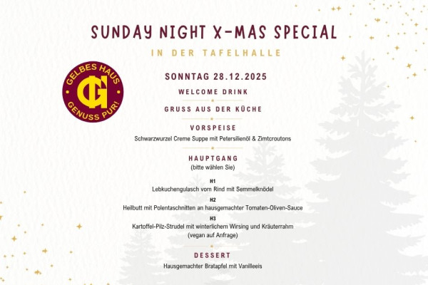 Das Menü für das SUNDAY NIGHT ORCHESTRA X-Mas Special am Sonntag, den 28.12.2025 kann hier bestellt werden: