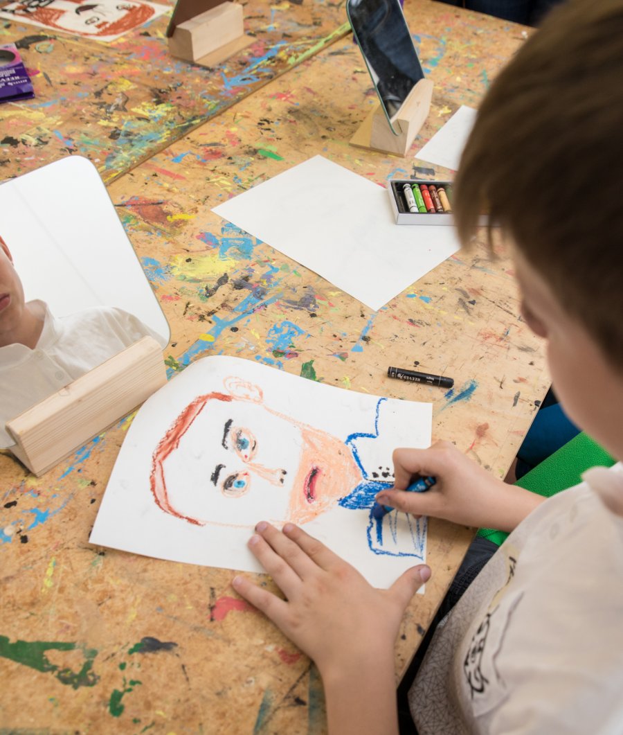 Dann werden wir selbst aktiv. Wir experimentieren mit Aquarellfarbe, Ölkreiden und Bleistift, so dass ganz abwechslungsreiche Arbeiten entstehen. Und für die Eltern bereiten wir zum Abschluss eine kleine Ausstellung vor.