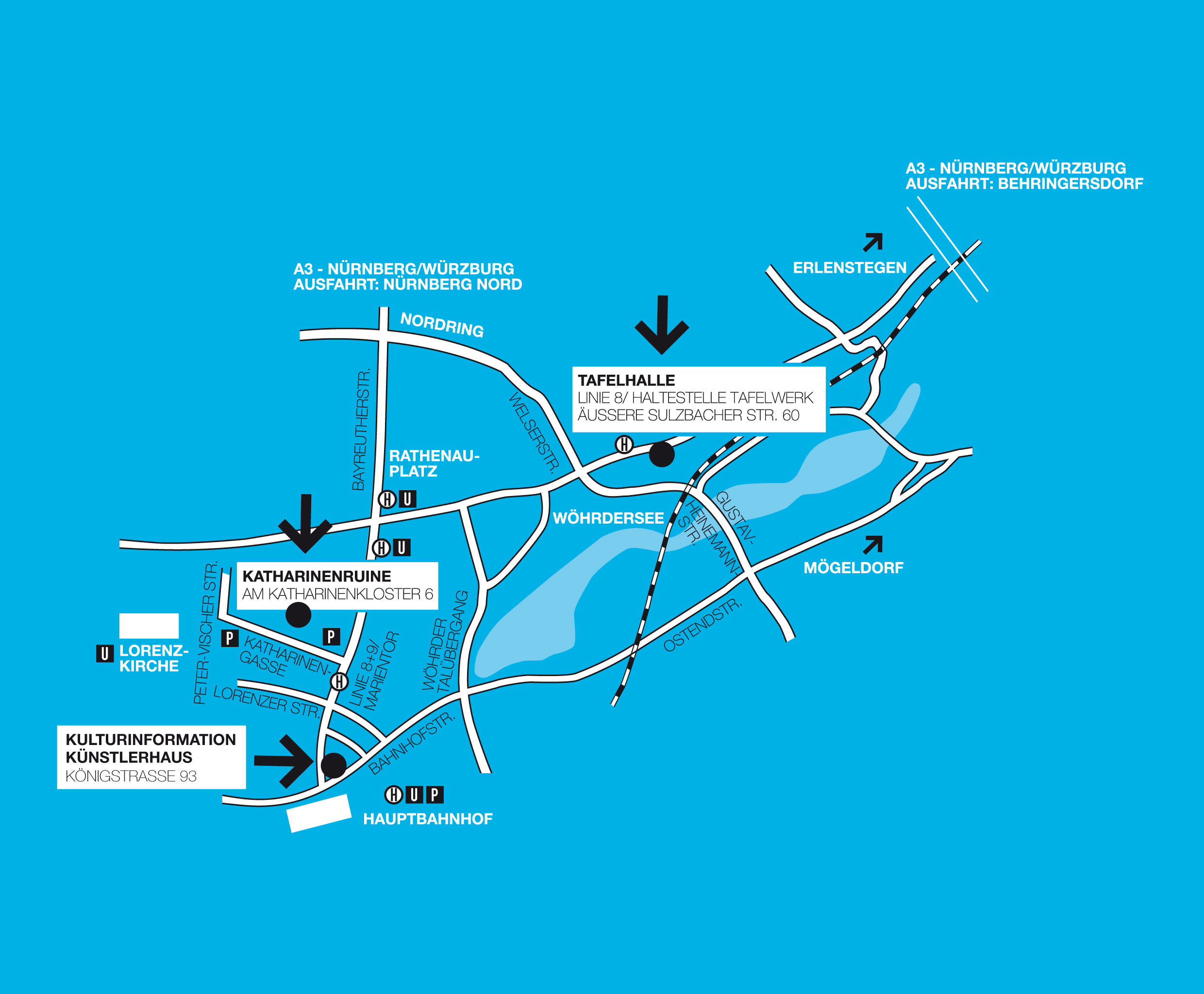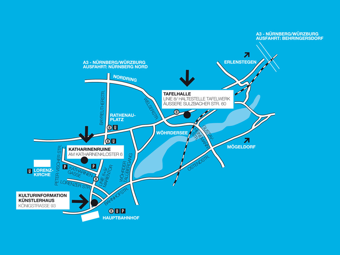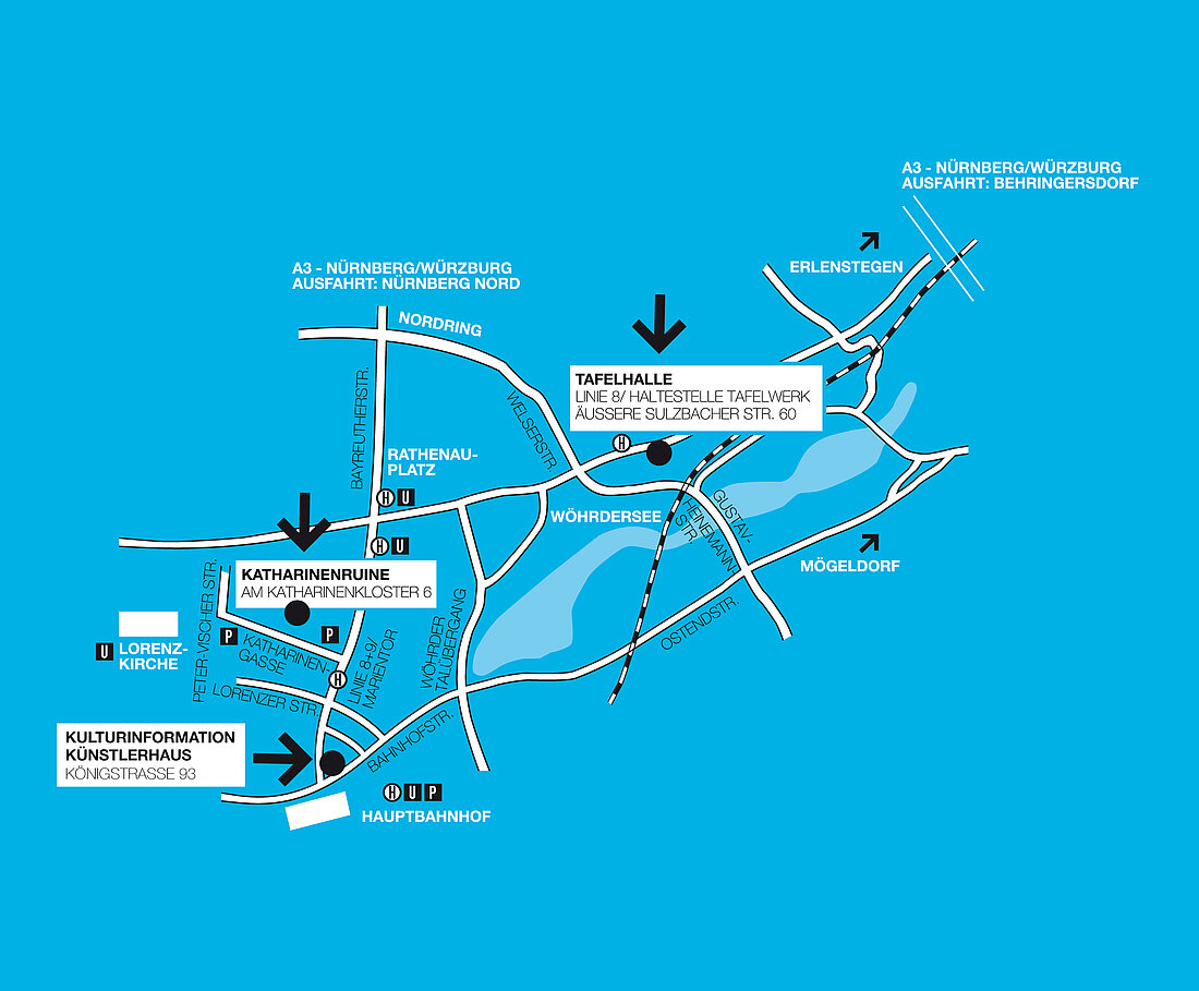 Von der A3 kommend, Ausfahrt Behringersdorf nehmen und Richtung Nürnberg (B14) fahren. Nach ca. 6 km (erst Erlenstegener Straße/dann Äußere Sulzbacher Straße) gegenüber der SUPOL-Tankstelle liegt auf der linken Seite die Tafelhalle.