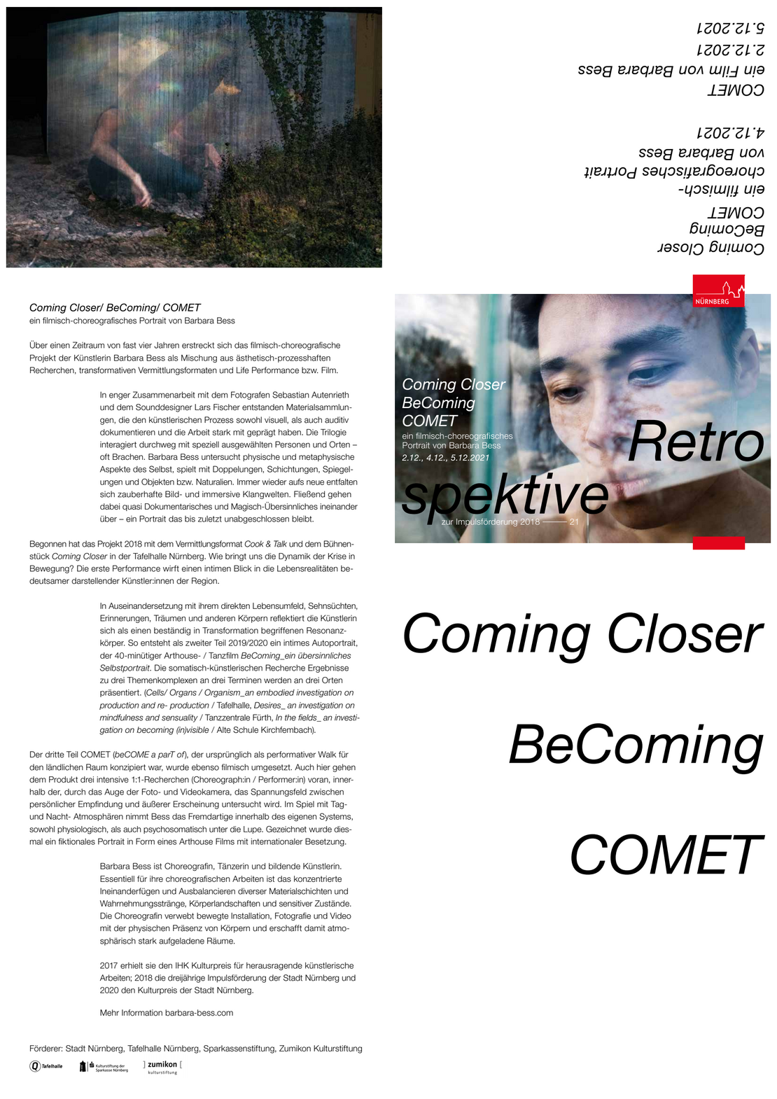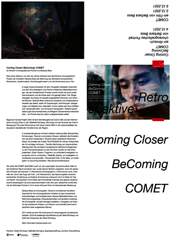 Wie ein Blick durch die Linse rückt dann die Live-Bühnen-Performance drei Künstler*innenpersönlichkeiten der regionalen Kulturszene auf die Haut. Schicht um Schicht projiziert werden Filmsequenzen und Photographien, die die Choreographin Barbara Bess an spezifischen Orten und extremen Plätzen - in Wohnzimmern verletzter Seelen, aufnehmen ließ. Coming Closer beleuchtet intensiv atmosphärische Zustände aus Lebensphasen von Jutta Czurda, Patrick Paolucci und Irfan Taufik. Lars Fischer verwebt diese mit subtil gesammelten Klängen von Orten, Körpern und Geschehen. Es tauchen Bruchstellen auf, die das künstlerische Leben in Frage gestellt oder befördert haben.