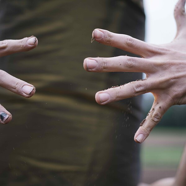 Der Abend beginnt mit einer 12-minütigen Performance im Außenraum. Während sich ein Tänzer vor der Glasfläche auf Spurensuche begibt, folgt das Publikum im Innenraum durch das Glas dem Geschehen.