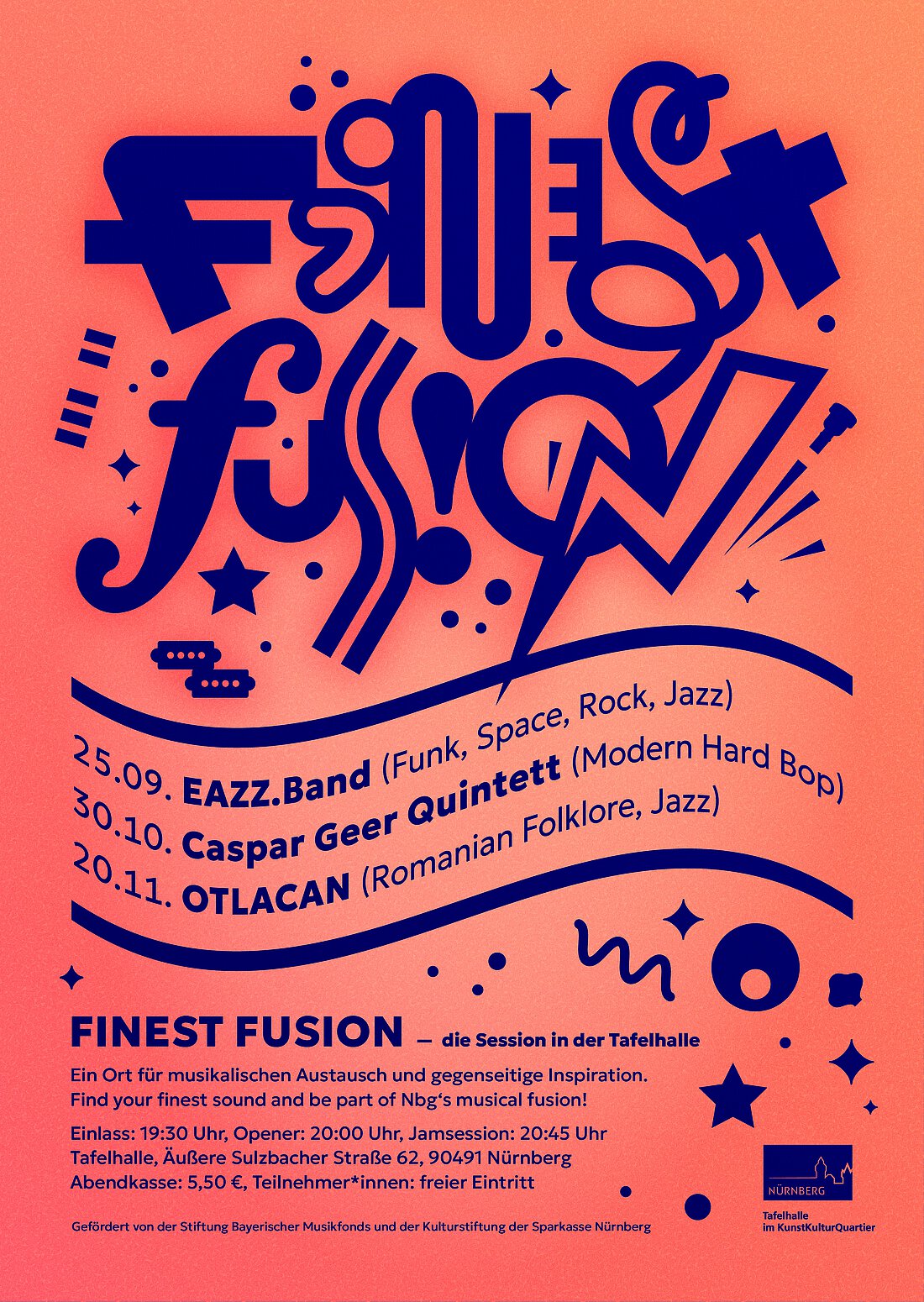Das Foyer der Tafelhalle öffnet einmal im Monat Türen und Bar und bietet viel Raum und Zeit für Sessions. Über einzelne Begegnungen auf der Session hinaus entsteht eine wachsende Gemeinschaft aus professionellen und angehenden Musiker*innen, die regelmäßig in musikalische Interaktion kommen können.