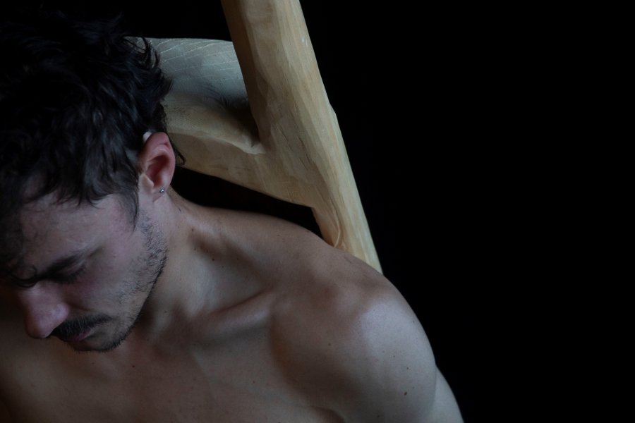 Männlichkeit und Mann-Sein verhalten zu müssen. Dabei steht ein Holzobjekt zwischen Phallus und Tragetasche als Mitakteur und Projektionsfläche mit auf der Bühne. Julian Lorenza arbeitet mit Gesten und verschiedenen Formen der Verkörperung, um sich der Frage zu nähern: Gibt es alternative Formen von Männlichkeiten oder muss Männlichkeit an sich überwunden werden?