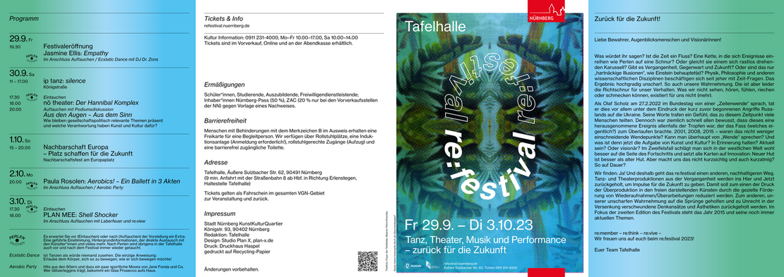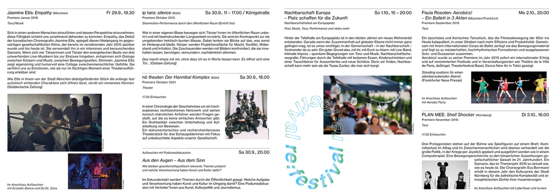 In der Mentalität unserer Leistungsgesellschaft ist das fest verankert; Produktivität und Wachstum galten lange als oberste Maxime. Hier setzen wir mit dem re:festival an, gehen einen Schritt zurück für die Zukunft: Wir brauchen nicht immer neue Produktionen. Deshalb holen wir Tanz, Theater, Performance, Musik und Zirkus aus der Vergangenheit ins Hier und Jetzt und ermöglichen Wiederaufnahmen. Schwindelerregend, zartfühlend und spannungsreich erforschen die Stücke die Beziehungen zwischen Mensch, Maschine, Künstlicher Intelligenz im generationsübergreifenden Austausch. Immer auf der Suche nach erfüllenden Verbindungen, nach liebe- und würdevollem Miteinander. Ringsherum bieten wir ein vielfältiges Rahmenprogramm mit Partys und vielen Begegnungsmöglichkeiten. Nehmen wir uns Zeit für erneute, ruhige Betrachtungen und suchen wir bewahrenswürdige Wertvorstellungen, menschliche Denkansätze und lebendige Ästhetiken für die Zukunft!